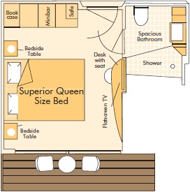 The Panorama Suites offer the same amenities and services as the RJ and BJ Junior Suites, but your location at the stern of the ship allows for panoramic windows on the side and rear, as well as an enlarged, wrap-around teak balcony.